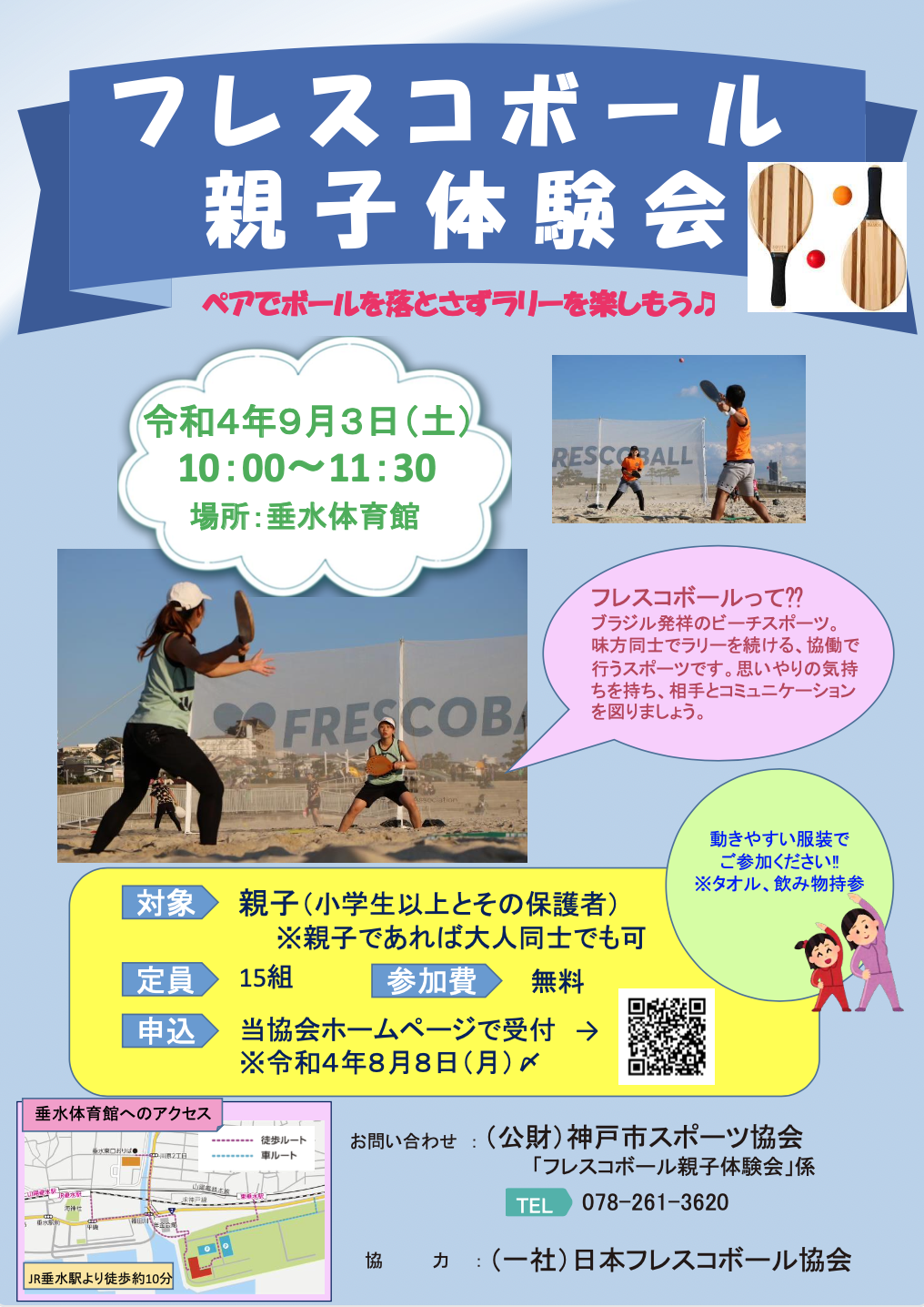 神戸市垂水区は、関西のフレスコボールのメッカ・大蔵海岸からほど近いエリア。本イベント後も、大蔵海岸にて毎週末フレスコボールを体験いただくことが可能です。子どもから大人まで、ぜひ多くの方にフレスコボールを継続して楽しんでいただきたいと考えております。