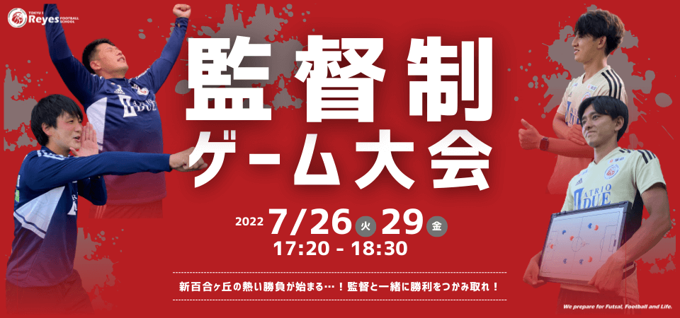 東急Sレイエス フットボールスクール リーヴ新百合ヶ丘では、7月26日(火)・29日(金)にリーヴ新百合ヶ丘フットサルクラブにて、小学3・4年生を対象とした真剣勝負の場『監督制ゲーム大会』を開催いたします。監督と共に熱い戦いをしたいお子様にはお勧めですので、ぜひこの機会にご参加ください。