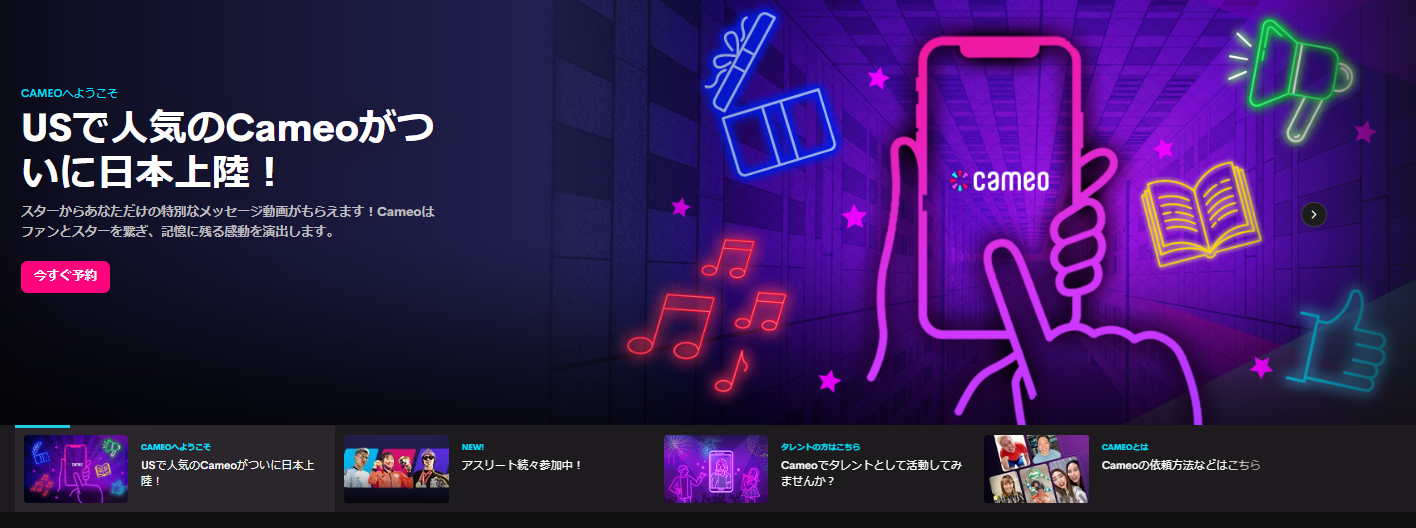 Cameo(キャメオ)は、2017年にSteven Galanis(スティーブン・ガラニス)、Devon Townsend(ディーボン・タウンセンド)およびMartin Blencowe(マーティン・ブレンコウ)らによってアメリカではじまった、タレントがファンへ個別のメッセージ動画を送ることができるリーディングマーケットプレイスです。パーソナライズされたビデオメッセージ、魅力的なファン体験、マーケティングやイベントのパートナーシップという形で、ファンやブランドと数万人のポップカルチャーパーソナリティを直接つなぎます。Cameoは2017年のサービス開始から5年間で合計約400万件、2021年だけでも約140万件のメッセージ動画を届けてきました。2022年には、ソフトバンク株式会社の支援のもと、日本での事業展開を開始いたしました。ファンに唯一無二の感動体験を届けることをミッションに、今後もファンとタレントを繋いでまいります。