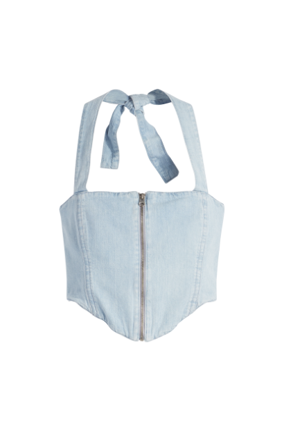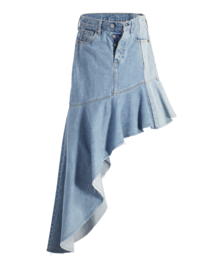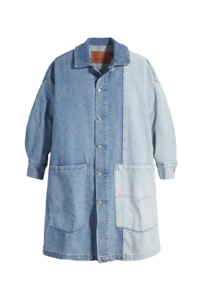 デニムとフリルという対照的な要素が同居するマーメイドスカートは、片側はショート丈、もう片側はマキシ丈に裾が斜めの線を描きます。また、ライトウォッシュのコンパクトなホルターネックトップは、マーメイドスカートのボリューム感を引き立てるのに最適です。さらに、オーバーサイズのアーティストコートは、ミドル丈、ワイドスリーブ、ドロップショルダーで、レッドタブとアーキュエイトステッチのついた大きなパッチポケットと、ミッドウォッシュデニムとライトウォッシュデニムの切り替えのコントラストが目を引きます。どのアイテムも、100% オーガニックコットンでつくられています。