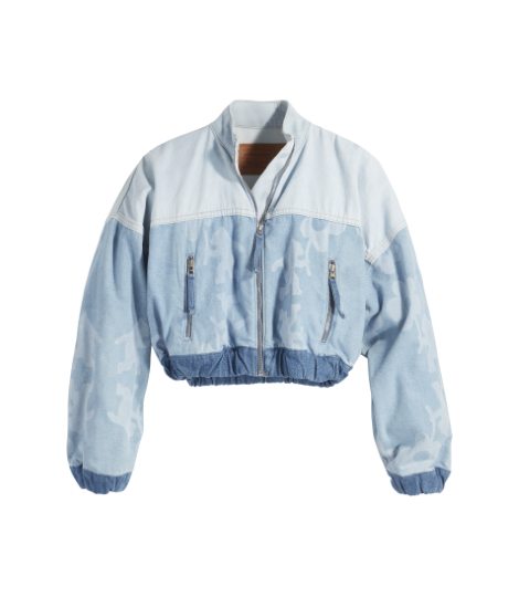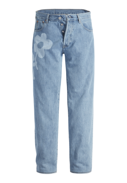 コレクションを締めくくるのは、クロップド丈で膨らみのあるジップアップボンバージャケット。100% オーガニックコットンを使用し、なおみの花とクマのロゴがレイザープリントで 投影された2色のデニムのコントラストが映える身頃と、シャーリングのかかった裾と袖が特徴です。さらに、花とクマのパターンをメンズの’93 501®に施した完璧なスラウチーフィットを実現する’93 Naomi Jeanも登場します。