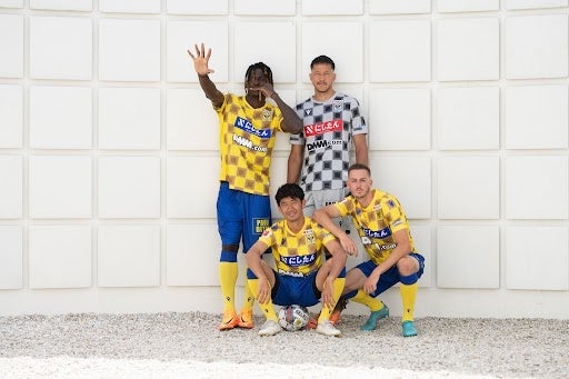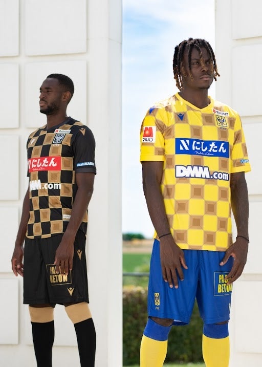 ベルギーと日本の架け橋、日本の良い文化を発信するというSTVVの理念に共感し、和を連想させる市松柄、勝利を象徴するチェッカーフラッグの柄を取り入れ、ホームユニフォームのベースカラーはイエロー、アウェイユニフォームはブラック、配色はどちらもゴールドと組み合わせてグラフィックを表現したデザインです。脇に大胆に配置した“神轟偉伝” は”神にも轟く偉人達の伝説” という意味で、“シント=トロイデン”を当て字にて表現しています。