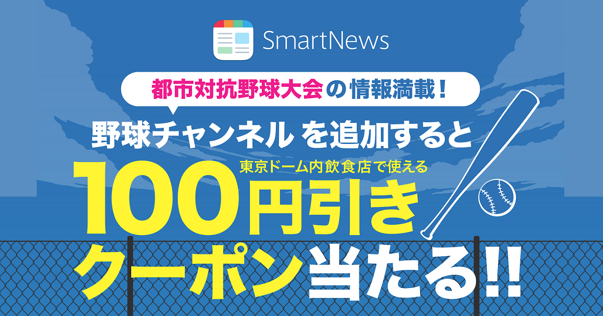 株式会社毎日新聞社(東京都千代田区、代表取締役社長執行役員:松木健)とスマートニュース株式会社(東京都渋谷区、代表取締役:鈴木健)は、7月18日(月・祝)開幕の第93回都市対抗野球大会に合わせて東京ドームでクーポン企画を行います。1回戦が行われる18日から23日までの6日間、来場者は、SmartNewsアプリをダウンロード。野球チャンネルを追加すると、東京ドーム内飲食店で使える100円引きのクーポンが抽選で1万⼈に当たります。