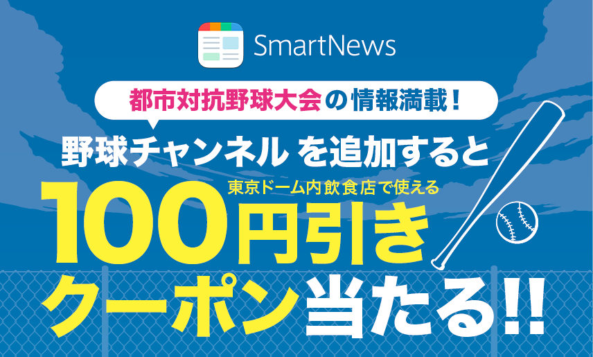 スマートニュース株式会社は、ニュースアプリ「SmartNews」の「野球チャンネル」にて、毎日新聞社主催の「第93回都市対抗野球大会」(以下:都市対抗野球大会)とコラボレーションし、全31試合のダイジェスト映像を配信するなど「都市対抗野球大会」に関する最新情報を配信。あわせて、試合日に球場の飲食売店で使える限定クーポンをプレゼントする抽選企画を開催します。「都市対抗野球大会」とは、毎年夏に東京ドームにて開催される、日本最大の社会人野球トーナメント大会です。今年は、2022年7月18日(月・祝)~2022年7月29日(金)にて開催され、日本全国より32チームが集まり頂点を競います。毎年40万人以上が来場する本大会。SmartNewsでは、都市対抗野球大会出場チームならびに選手を応援する皆様の力になれるよう、今回の企画をご用意しました。