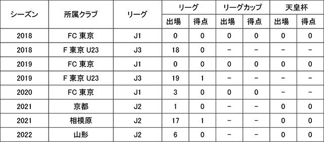 所属歴/市川FC – FC東京U-15深川 – FC東京U-18 – FC東京 – 京都サンガF.C. – SC相模原 – モンテディオ山形