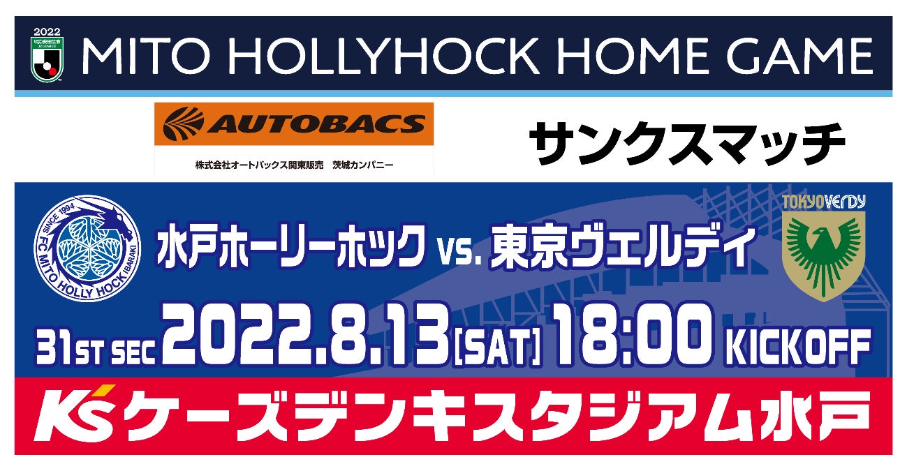 このたび、8月13日(土)に開催します2022明治安田生命J2リーグ第31節 水戸ホーリーホックvs東京ヴェルディ戦を、株式会社オートバックス関東販売 茨城カンパニーにご支援いただき『オートバックスサンクスマッチ』として開催いたします。