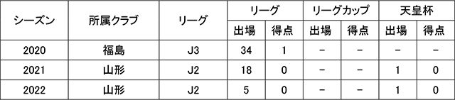 J2リーグ戦通算 23試合0得点 / J3リーグ戦通算 34試合出場1得点