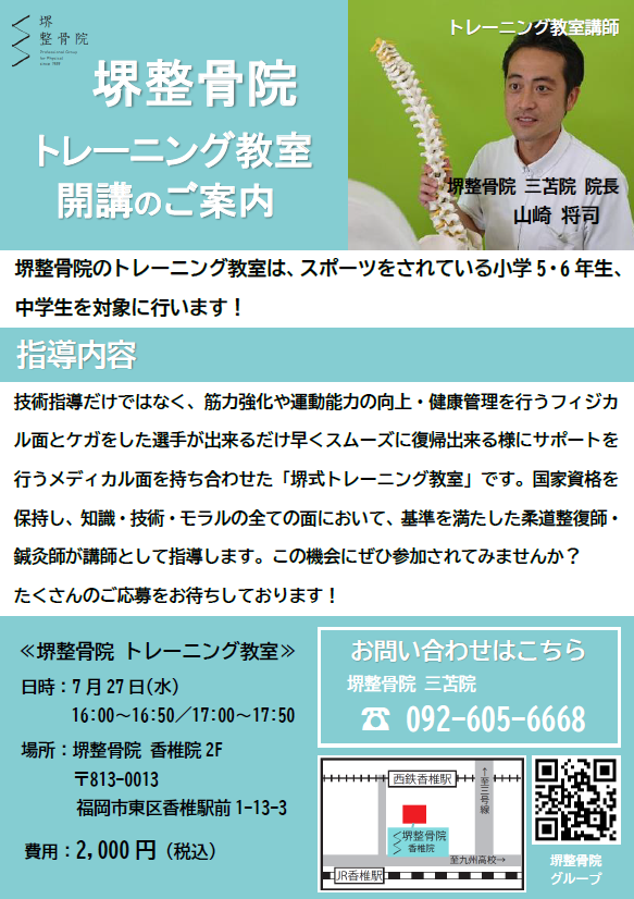 堺整骨院グループが行う「トレーニング教室」は、スポーツをされている小学5・6年生と中学生対象に行われます。