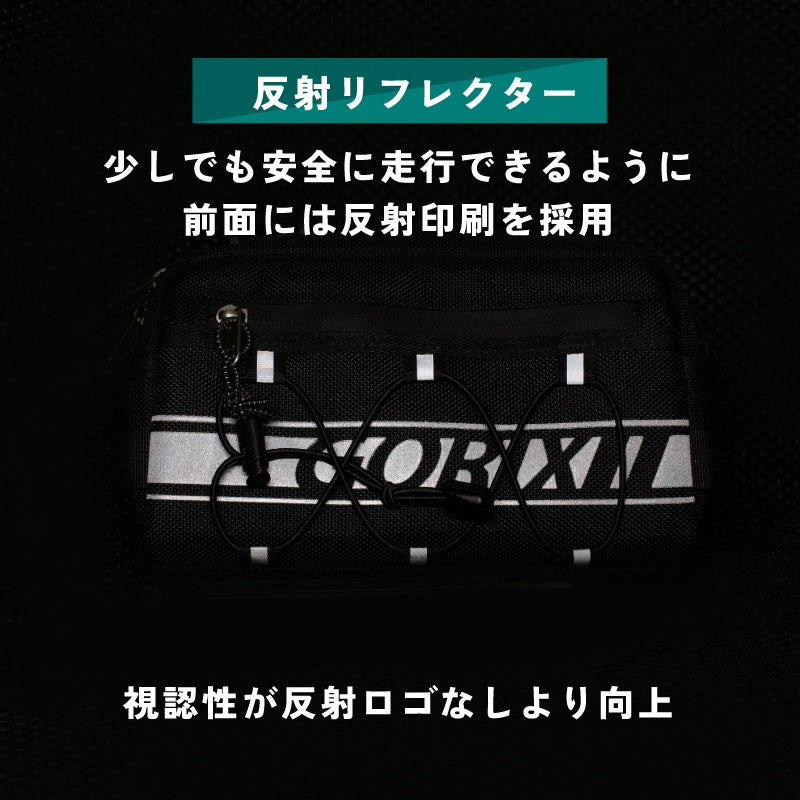 フロントバッグの前面には反射ロゴ採用で夜間の走行も安全に。