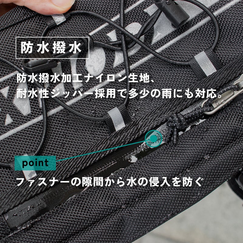 防水撥水加工ナイロン生地、耐水性ジッパー採用で多少の雨でも対応します。