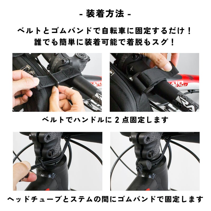 ヘッドチューブとステムの間にゴムストラップで固定します。