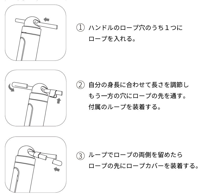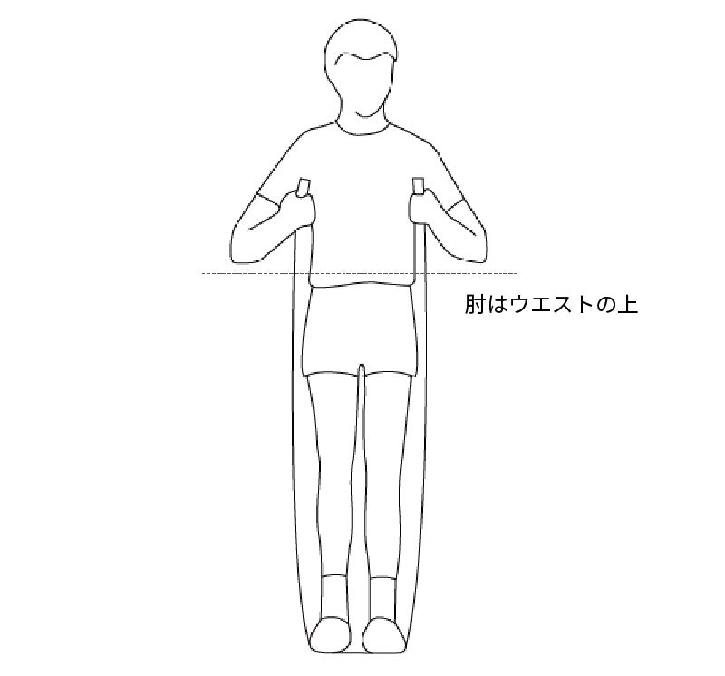 両手でハンドルを持った状態で足をロープの上に乗せ、写真のように両手を90度の角度に保った時の長さがおすすめです。