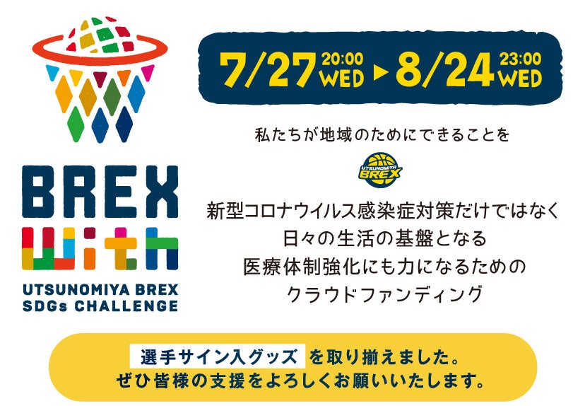 宇都宮ブレックスは、新型コロナウイルス感染症対策および、日々の生活の基盤となる医療体制強化の力になるためのクラウドファンディングを、2022年7月27日(水) 20:00から8月24日(水) 23:00まで実施します。