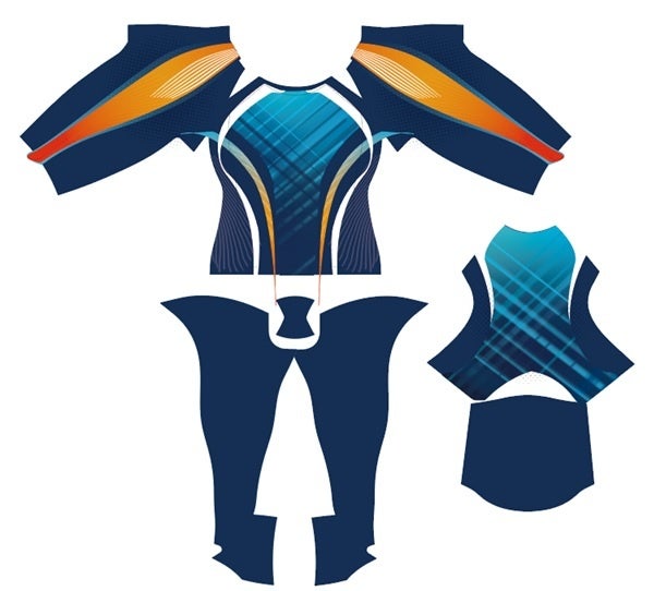デザインテーマは疾走感です。疾風や炎をイメージし、青を基調とした爽やかで明るい色と、パワーを感じさせる活力あるオレンジを差し色にデザインしました。また、腕の部分は筋肉を連想させるデザインを取り入れました。腕部分の色をはっきりと分けることで、動きがわかりやすくなり、練習やレースのフォームチェック時にマーカー機能を果たします。
