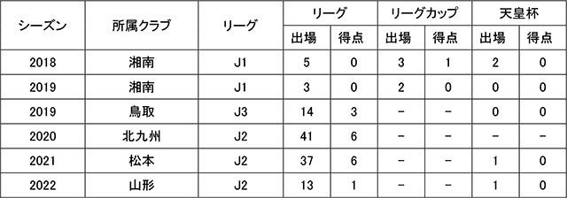 J1リーグ戦通算 8試合出場0得点 / J2リーグ戦通算 91試合出場13得点 / J3リーグ通算 14試合出場3得点