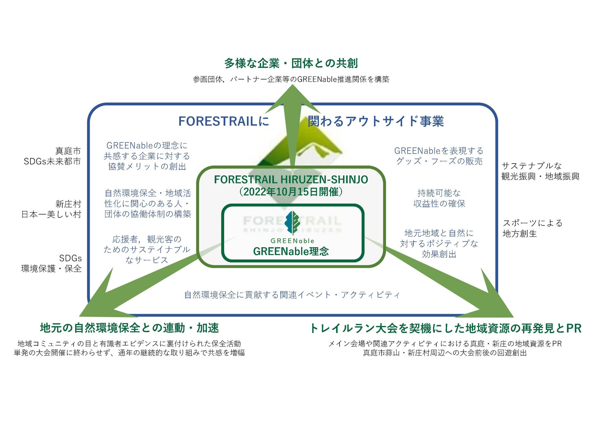 FORESTRAILはこれまで、新庄村の地方創生として2016年から開催してきました。2019年の台風直撃、その後のコロナ禍で大会中止に追い込まれましたが、今年のFORESTRAIL HIRUZEN-SHINJO2022は、地方創生に加えて、大会エリアである国立公園を含む蒜山・新庄村の自然環境の<利用と保全>を高いレベルで両立させるべく,真庭市と阪急阪神百貨店によって創出された<GREENable>の理念を基盤にリノベーション致しました。