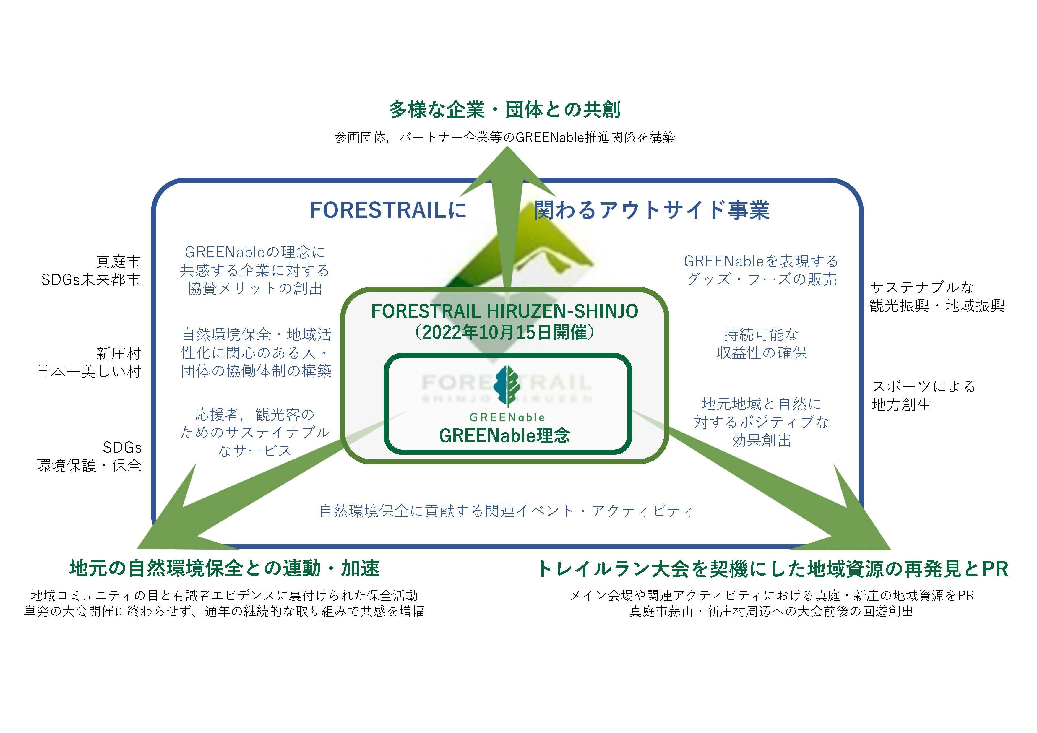 FORESTRAILはこれまで、新庄村の地方創生として2016年から開催してきました。2019年の台風直撃、その後のコロナ禍で大会中止に追い込まれましたが、今年のFORESTRAIL HIRUZEN-SHINJO2022は、地方創生に加えて、大会エリアである国立公園を含む蒜山・新庄村の自然環境の<利用と保全>を高いレベルで両立させるべく,真庭市と阪急阪神百貨店によって創出された<GREENable>の理念を基盤にリノベーション致しました。