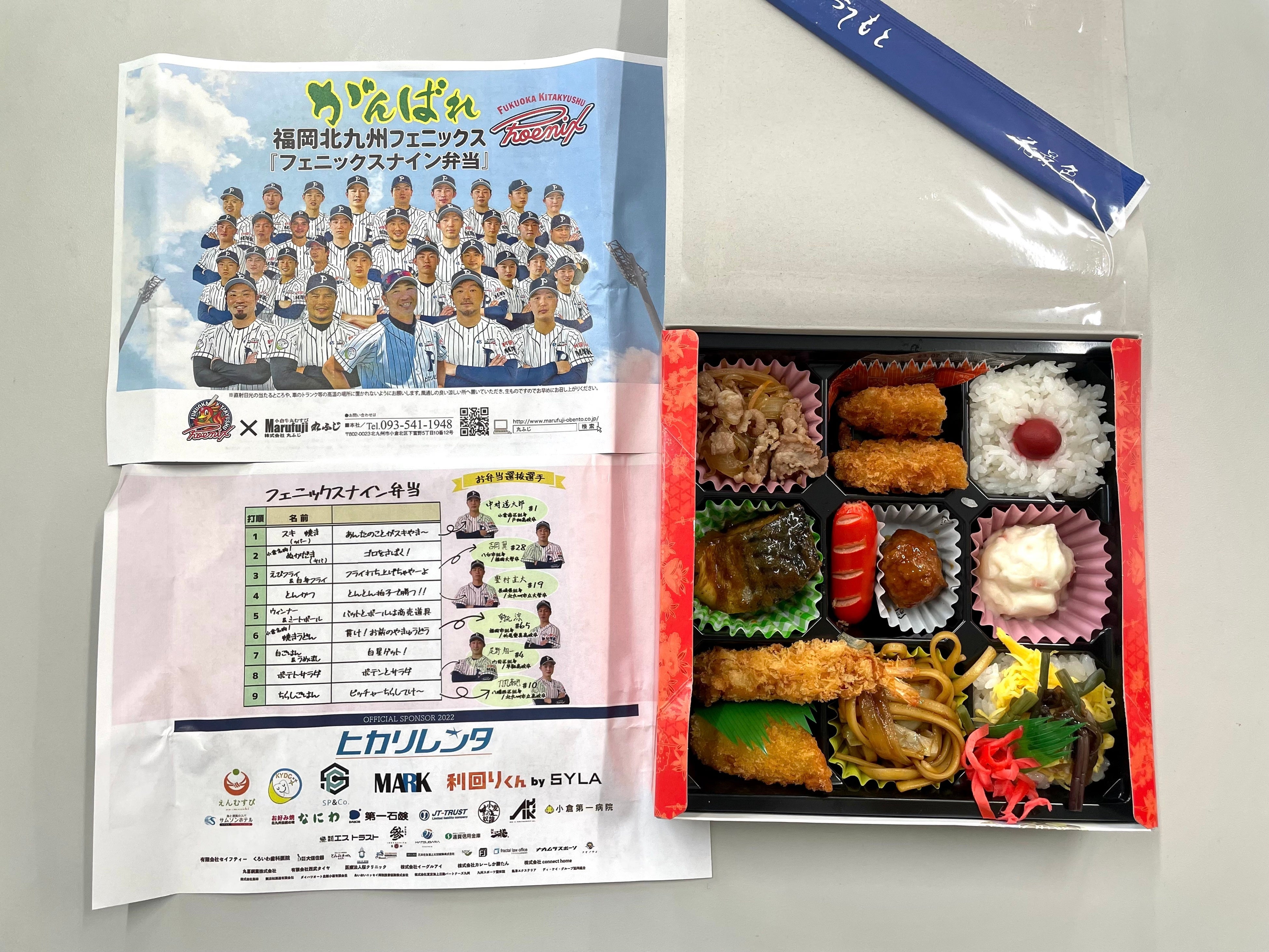福岡北九州フェニックスは、北九州の味にこだわったお弁当を展開する、株式会社丸ふじと共同で、北九州コラボ弁当『フェニックスナイン弁当』を作成いたしました。コラボ弁当制作にあたり、北九州市にゆかりのある選手がおかずを選出しました。コラボ弁当は8月5日(金)から始まる北九州市民球場での試合にて数量限定発売いたします。