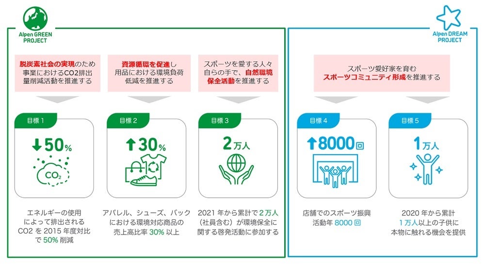 当社では、スポーツが溢れる未来の実現に向けて、スポーツを楽しむための自然環境を守る活動『Alpen GREEN PROJECT』、スポーツ愛好家を育んでいくための活動『Alpen DREAM PROJECT』に取り組んでおります。「脱炭素社会の実現」「資源循環の促進」「自然環境保全活動の推進」「スポーツコミュニティ形成の推進」という4つのターゲットを軸に、2027年までに達成を目指す5つの目標を設定し、全社をあげて活動を推進しております。