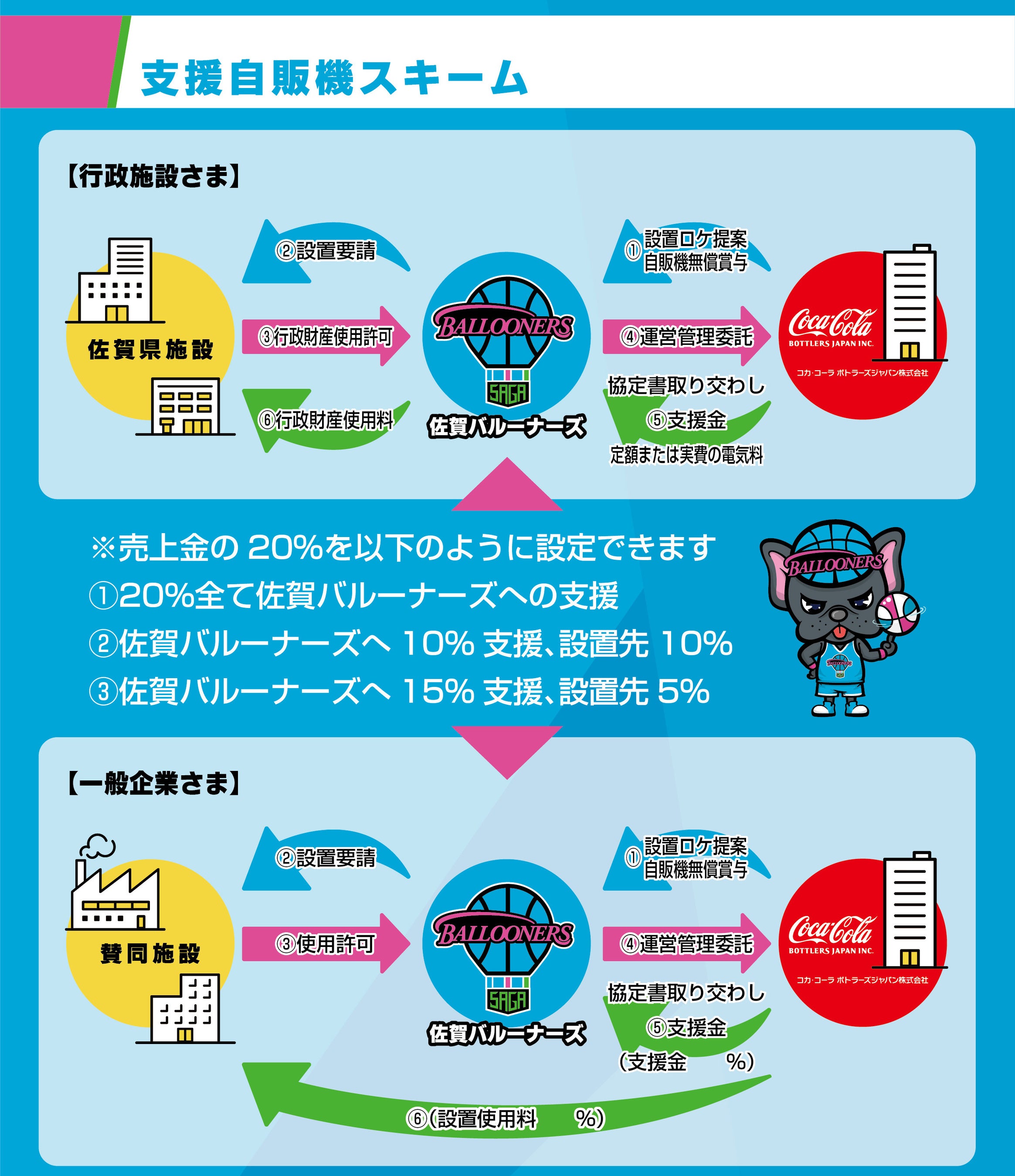 このたび佐賀バルーナーズでは、コカ・コーラボトラーズジャパン株式会社さまご協力のもと、クラブの応援自動販売機を設置することとなりましたのでお知らせいたします。