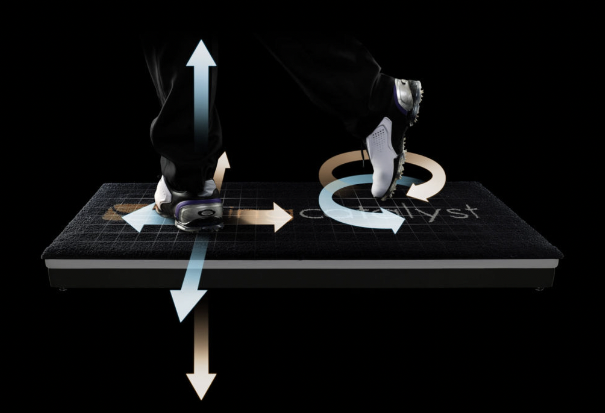 こちらはタイガーウッズの自宅にあるシミュレーションルームをそのまま再現した個室となっており、打席の足元は2000を超える高分解能圧力センサーで構成されたバランスプレート「SWING CATALYST(スイングカタリスト)」を設置。スイング中のバランス、プレッシャーの移動が解析ができ、足圧の中心のデータと、足裏全体のデータが可視化されます。