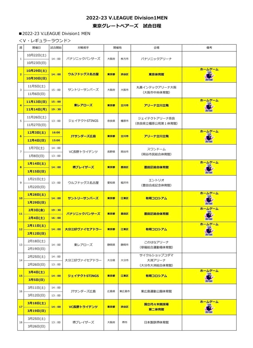東京グレートベアーズの2022-23シーズン V.LEAGUE DIVISION1 MENの試合日程と試合会場が決定しましたことをお知らせ致します。(2022年8月1日時点)