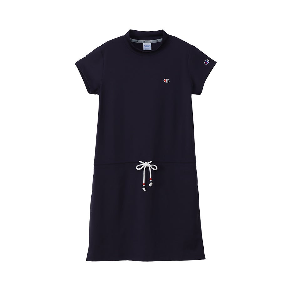 ポリエステルにポリウレタンを配合した動きやすいジャージー素材を使用したワンピースです。高いストレッチ性とUVカット機能を備えています。胸にCロゴを刺繍し、袖にワンポイントのグラフィックの刺繍、後部の裾にはChampion(チャンピオン)ロゴをプリントしました。ウエストは長さを調節できるドローコードでブラウジングすることで、セットアップ風に着こなすこともできます。後部には2つのポケットが付いています。汗によるニオイの発生をアクティブに抑制し続ける抗菌・防臭機能「C ODORLESS® by Polygiene」加工をしています。