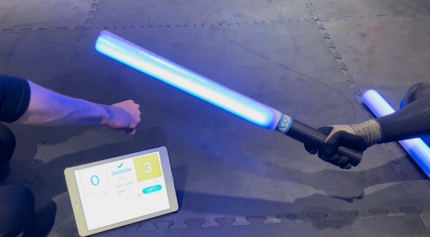 試合で使用する「SASSEN刀(とう)」には圧力センサーや加速度センサー類が装備されており、スマホアプリとBluetoothで連動している。