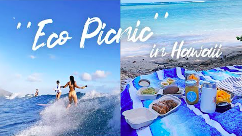 サーフィンを楽しんだ後に、ハワイに来た観光客でもできるサスティナブルなアクションは何かないだろうか?と考えた3人は、ゼロ・ウェイスト、ノープラスチックの「エコピクニックをやってみよう!」とKCCファーマーズマーケットへ買い出しに。そこで感じた現状や課題、サスティナブルサーチなどを彼女たちの目線でわかりやすく