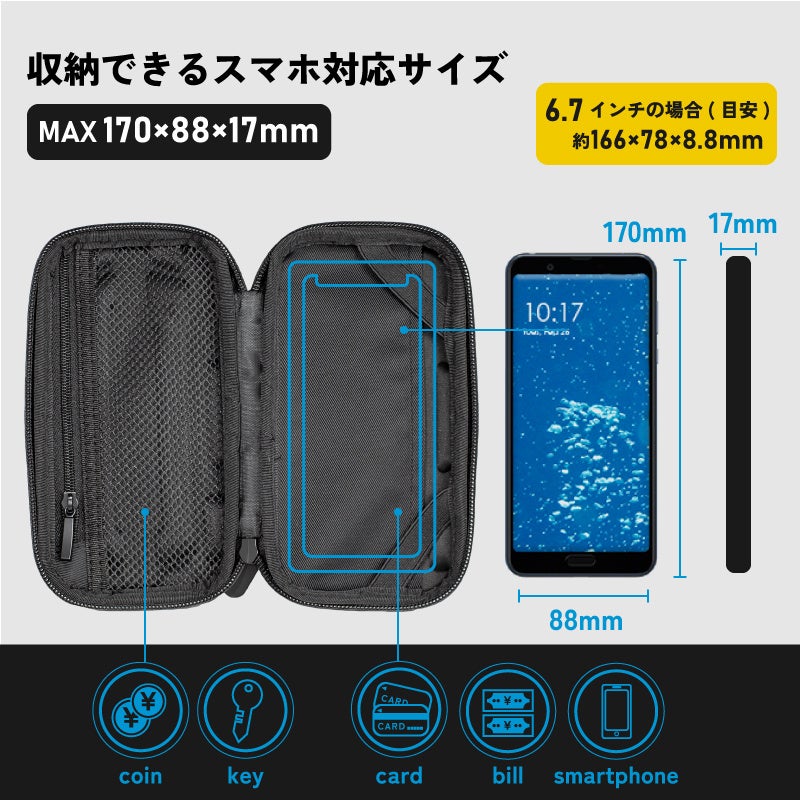 170×88x17mmまでのスマートフォンが収納可能。