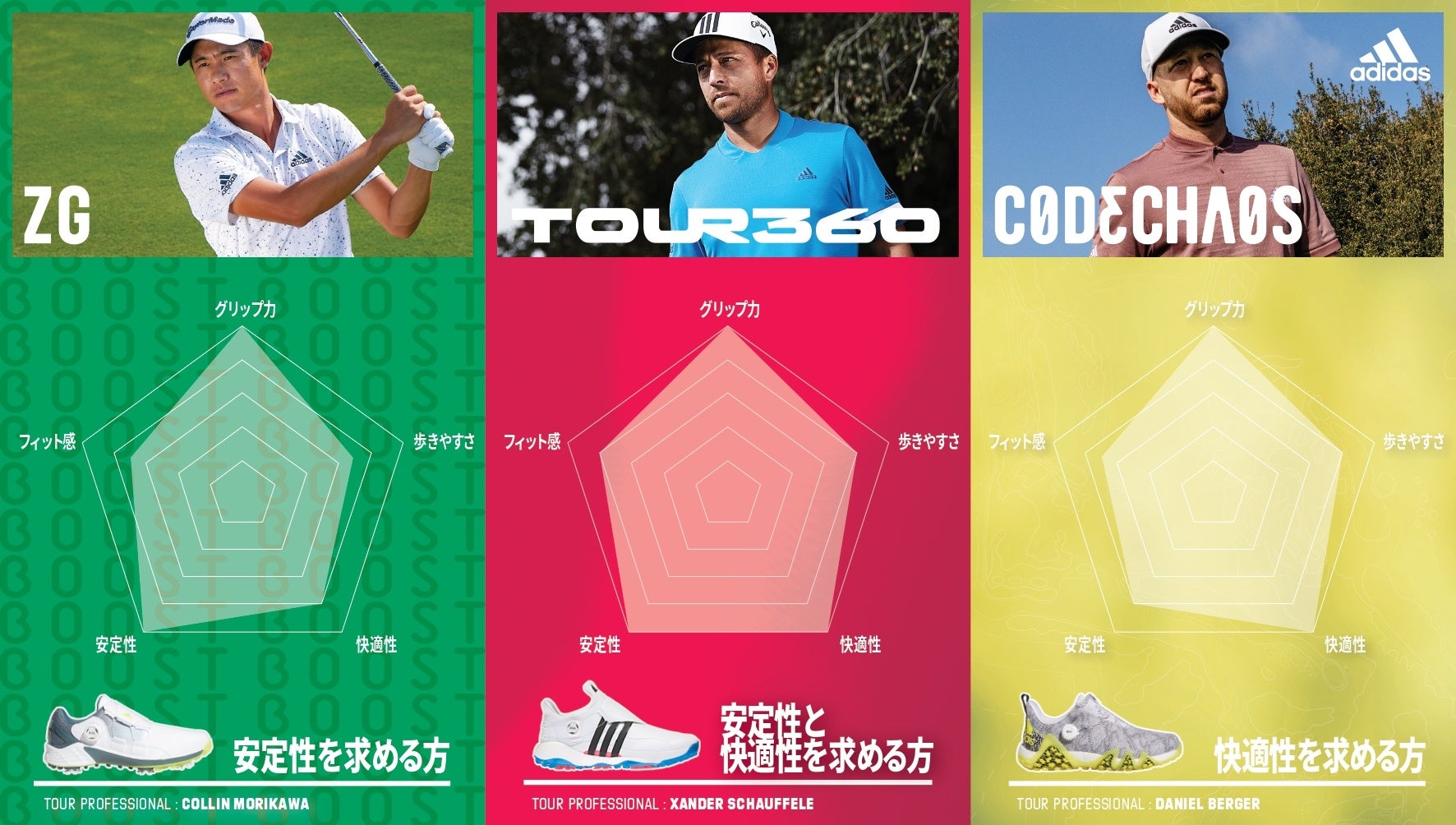 “秩序破壊”でパワーアップした「コードカオス」に加え、2022年2月にニューモデルを発売したアディダスのフラッグシップモデル「TOUR360」、妥協ゼロで開発した「ZG」は、アディダスゴルフを代表する3つのシリーズです。特性の異なる各シリーズは、好みのプレイスタイルやその日のコンディション、コースの状態などによって、プロゴルファーをはじめ、あらゆるゴルファーのパフォーマンスを、足元から支えます。