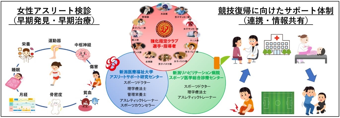 本学はこれまでに、本学女性アスリートを対象として、学内における女性アスリートの医科学支援体制を構築してきました。そこで本事業では、この体制をさらに発展させ、新潟県の女性アスリート・指導者が女性アスリートに対して、専門的・包括的な医科学的支援を受けられる「産官学連携による女性アスリートの医科学支援拠点」を形成します。これにより、新潟県の女性アスリート(様々な競技種目・年代・競技レベル)・指導者が居住地域等で競技力向上を図りながら安全かつ安心して、専門的・包括的な医科学支援、自身の健康問題に対する理解の促進、予防及び早期発見に向けた適切な教育を受けることができる地域社会の実現を目指します。