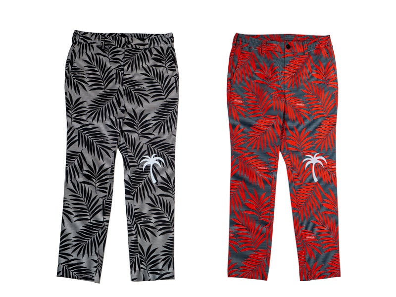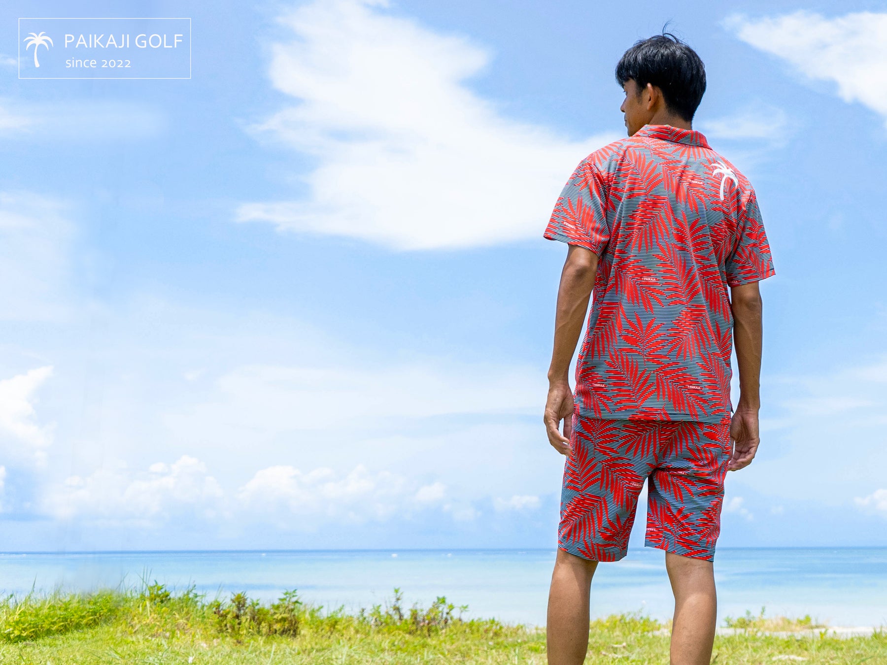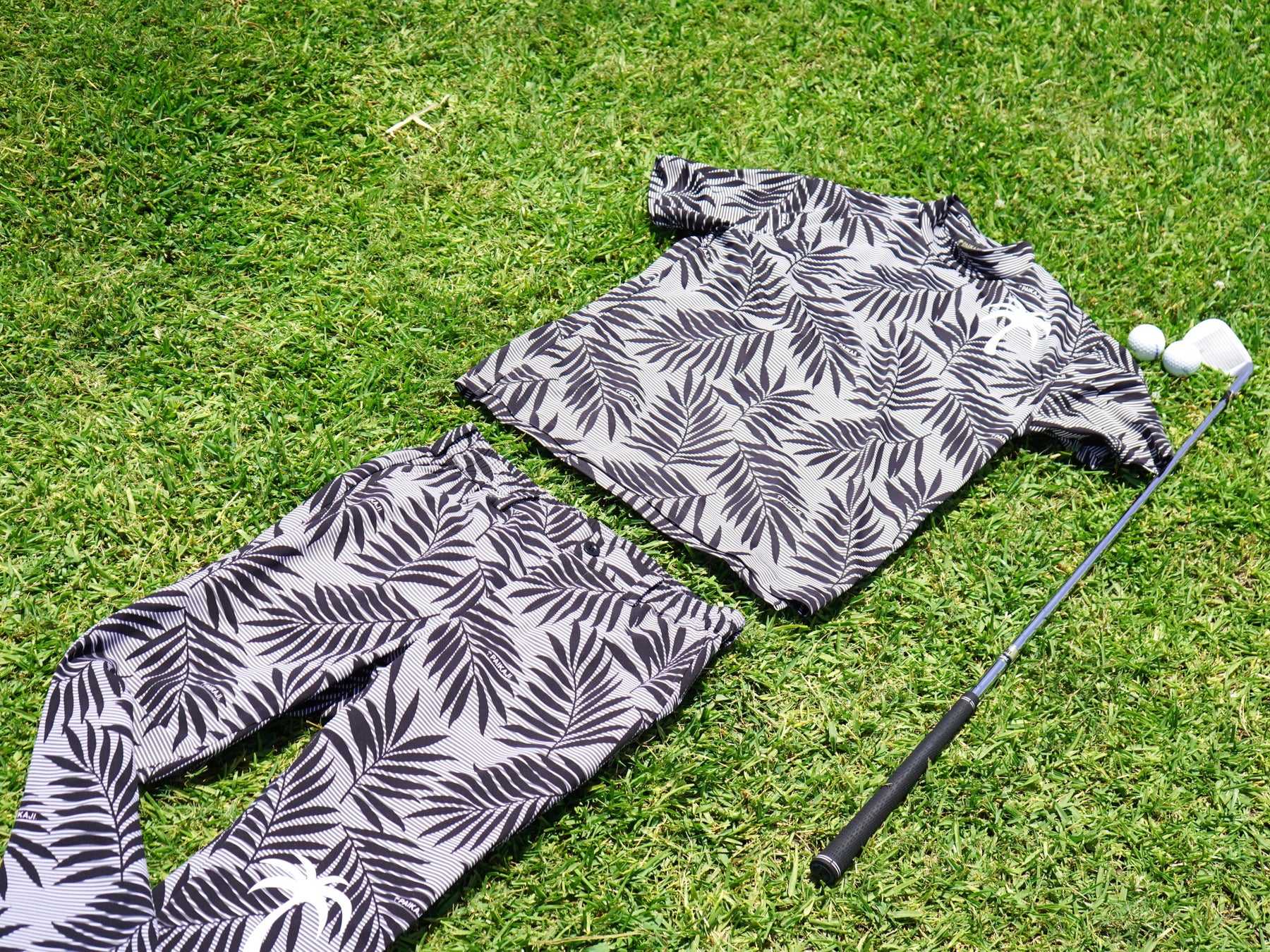 目を引くのは大胆にあしらわれたやしの葉プリントにブランドロゴの「パームツリー」が用いられ、ゴルフ場で着用するのはもちろんですが日常の生活空間にも溶け込む2wayアイテム。休日の午後、カフェのテラス席でリラックスして過ごすシチュエーションにもおススメです。