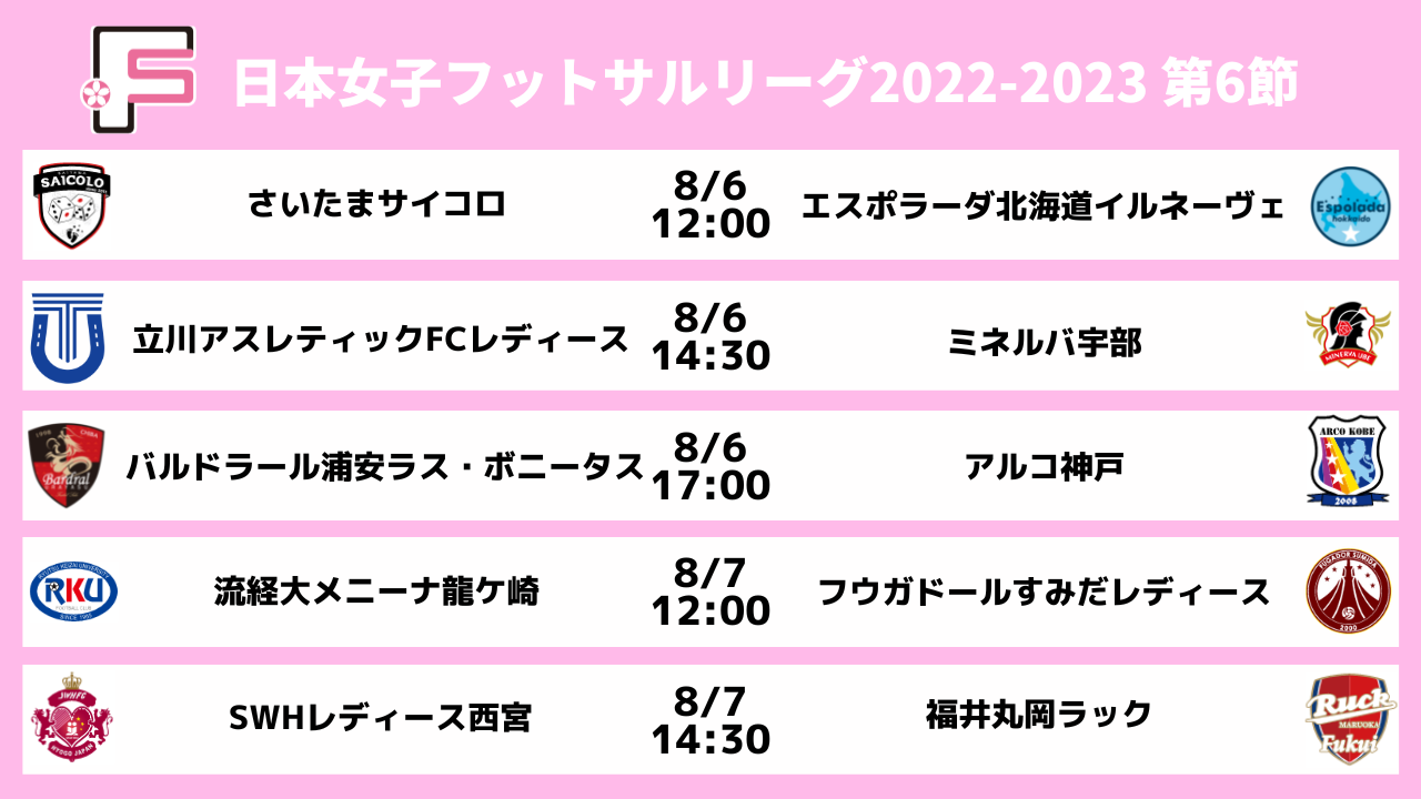 8月6日(土)から8月7日(日)に、バルドラール浦安アリーナにて日本女子フットサルリーグ2022-2023 第6節を開催します。今シーズンもSPOTV NOW(登録・視聴無料)にて全試合をライブ配信いたしますので、ぜひご視聴ください!