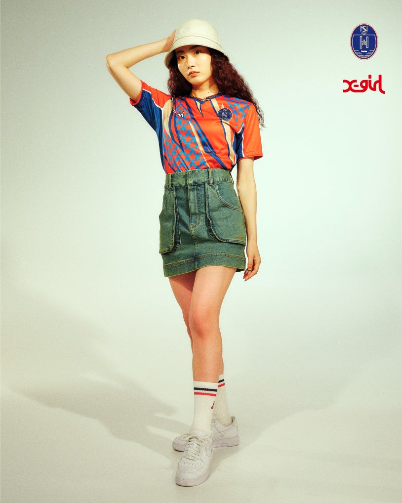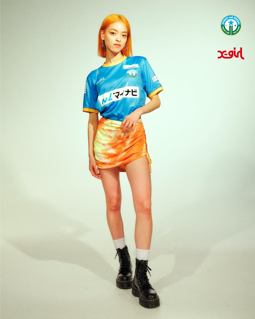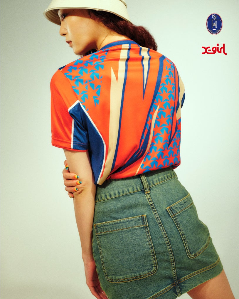 6クラブのそれぞれの個性を表現したデザインやアイコニックなカラーリングとX-girlの個性が融合したスタイリングとなっています。コーディネートの特徴は、ユニフォームをメインとし、デザイン性のあるスカートやフレアパンツを使用したX-girlらしいスタイリングに仕上げました。ピッチ上の選手とともに、ストリートを彩るファッション性の高いスタイリングとなっています。