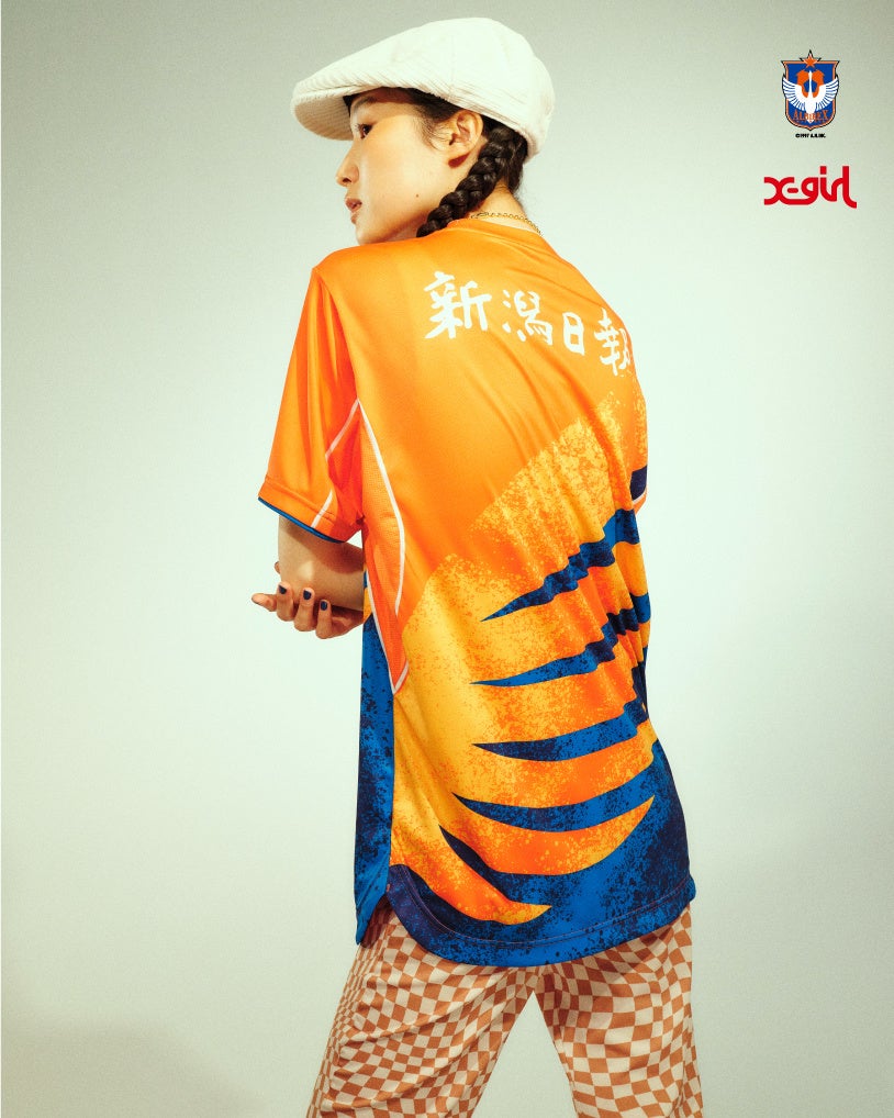 白鳥の翼のモチーフを身頃に大胆に配置したデザイン。 ピッチの上を舞い躍動し、将来世界を相手に大きく羽ばたいていく選手たちの様子を、そのままユニフォームで表現しています。シャツの下半分は日本海をイメージしたブルーの配色。翼の中とブルー部分には細かいエアブラシのテキスタイルをアクセントとして加えており、これはユニフォームの表面感に奥行きをつけるだけでなく、新潟の星空・雪・日本海のさざなみなどを表現しています。
