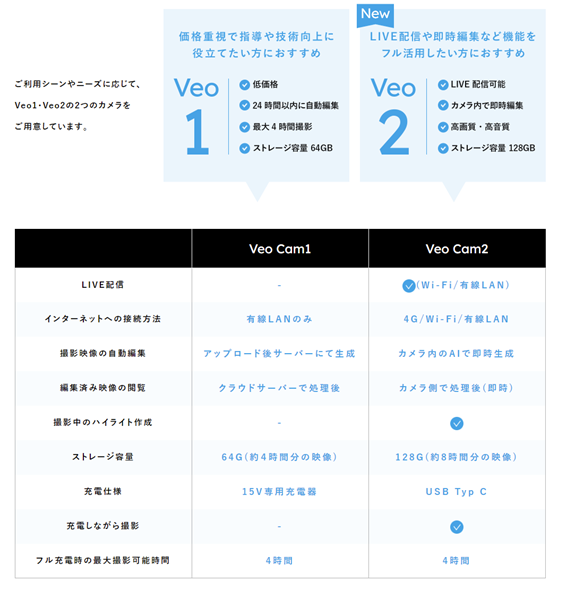 特徴:Veo1の機能に加えて、ライブ配信や高品質な映像が質を求めるチームにお勧めです。