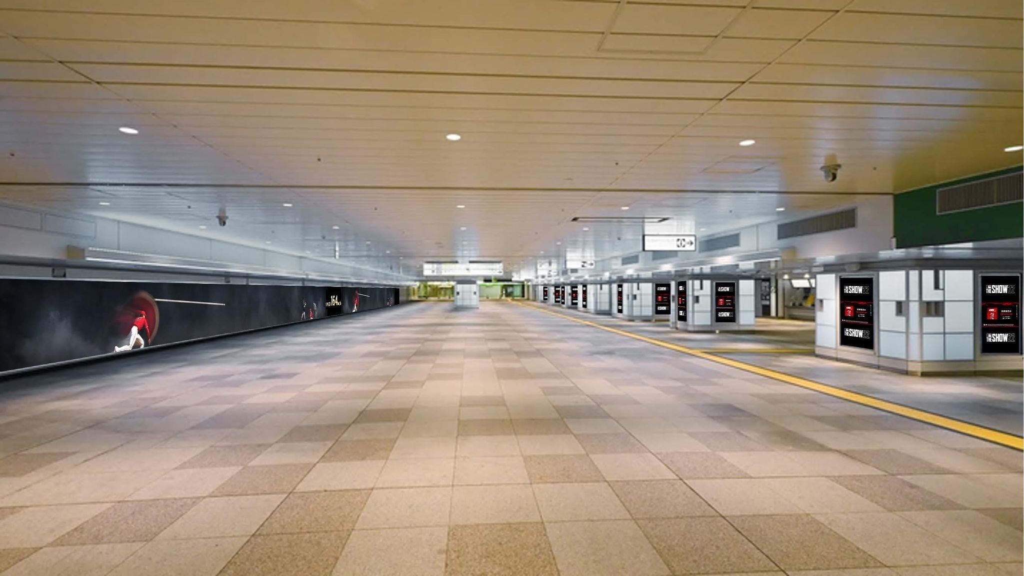 今回、放映する内容は『MLB® The ShowTM 22』 (英語版)に登場する大谷翔平選手のピッチングシーンとバッティングシーン、盗塁シーンになります。45.6mある超横長の大型LEDビジョン上において、ピッチングシーンでは渡米後に記録した約164キロの速度でストレートが、バッティングシーンでは191.5キロの豪速球が横切ります。そして盗塁シーンでは、大谷翔平選手が記録した、時速31.6キロという驚異的なスピードの走塁を見ることができます。大谷選手がその場にいるようなリアルなグラフィックと日本が世界に誇るメジャーリーガーのスピード感を是非新宿駅でお楽しみください。