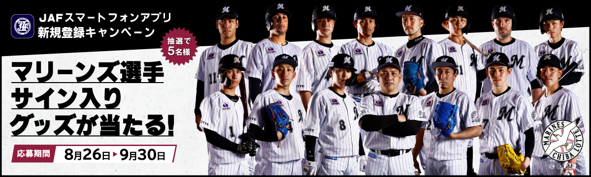 まだJAFアプリに登録されていない方が参加できるキャンペーンを、2022年8月26日(金)~9月30日(金)に実施。期間中にJAFスマートフォンアプリを新規登録(ログイン)され、専用フォームからアンケートに回答し登録された方に抽選で千葉ロッテマリーンズ選手サイン入りグッズを5名さまにプレゼントいたします。