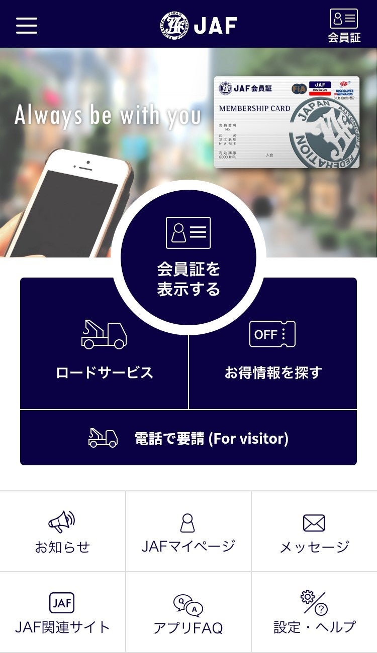 JAFスマートフォンアプリはロードサービス要請や会員優待サービス検索、そしてそれらのサービスを受けるうえで必要な会員証の表示ができるJAFのサービスがひとつになった公式アプリです。