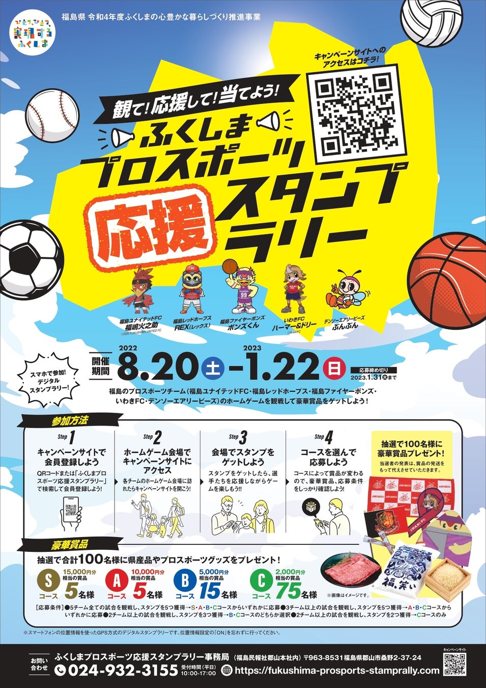 福島県は、福島県内に拠点を置く5つのプロスポーツチームのホームゲームを対象に「観て!応援して!当てよう!ふくしまプロスポーツ応援スタンプラリー」を8月20日からスタートさせます。