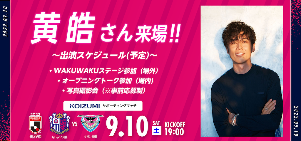 9 月10 日(土)に開催される2022明治安田生命J1リーグ第 29 節サガン鳥栖戦に、黄皓さんがご来場されますのでお知らせいたします。