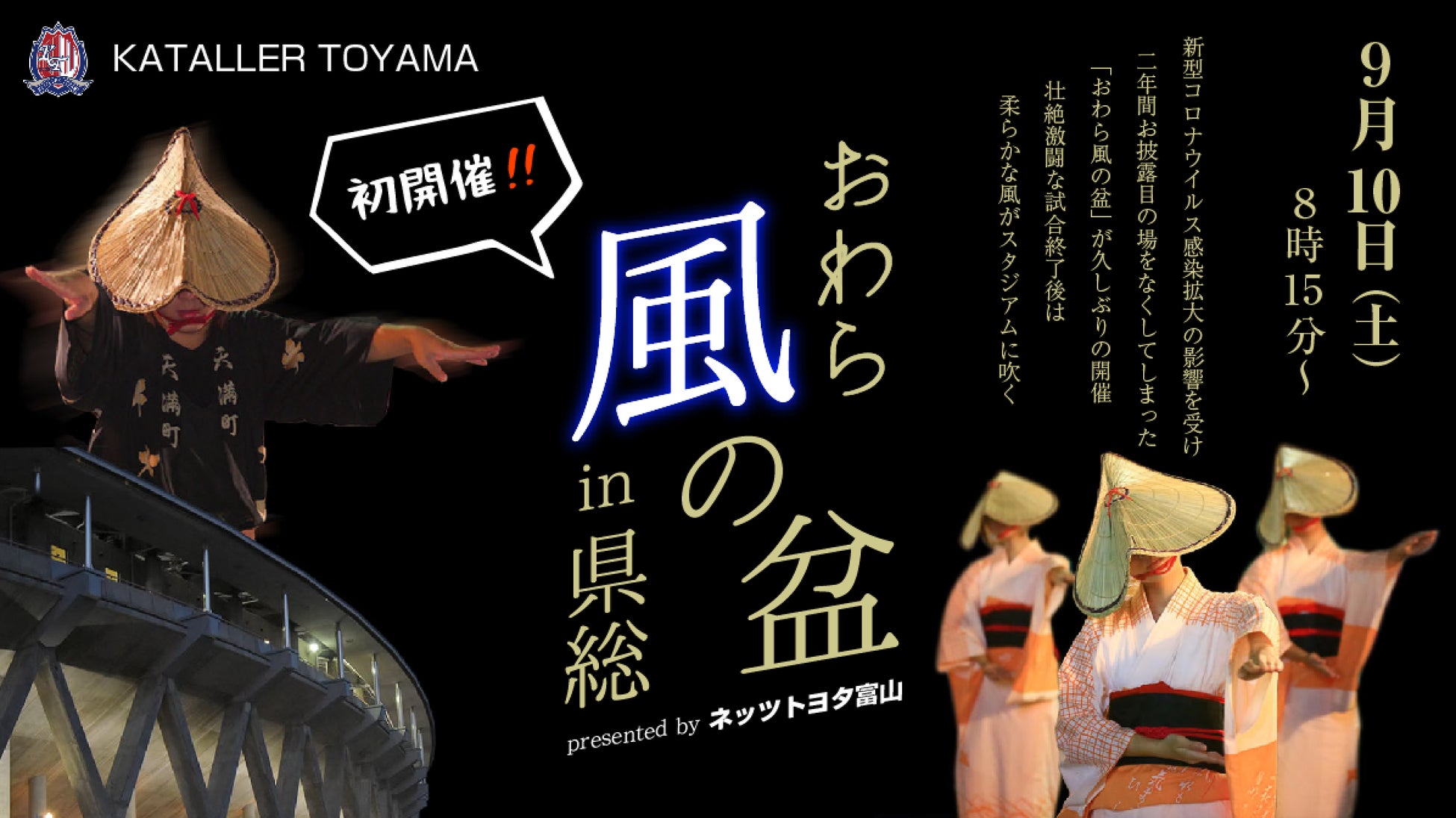 J3リーグ・カターレ富山は、8月24日11:00より、ネッツトヨタ富山 本店(富山市新庄本町3-3-33)にて、9月10日(土)に富山県総合運動公園陸上競技場で開催される、ホームゲームの特別スポンサーをネッツトヨタ富山が務めること、試合後の同会場で総勢60名が、おわら風の盆を披露する企画「おわら風の盆in県総」の実施を発表する記者会見を予定している。