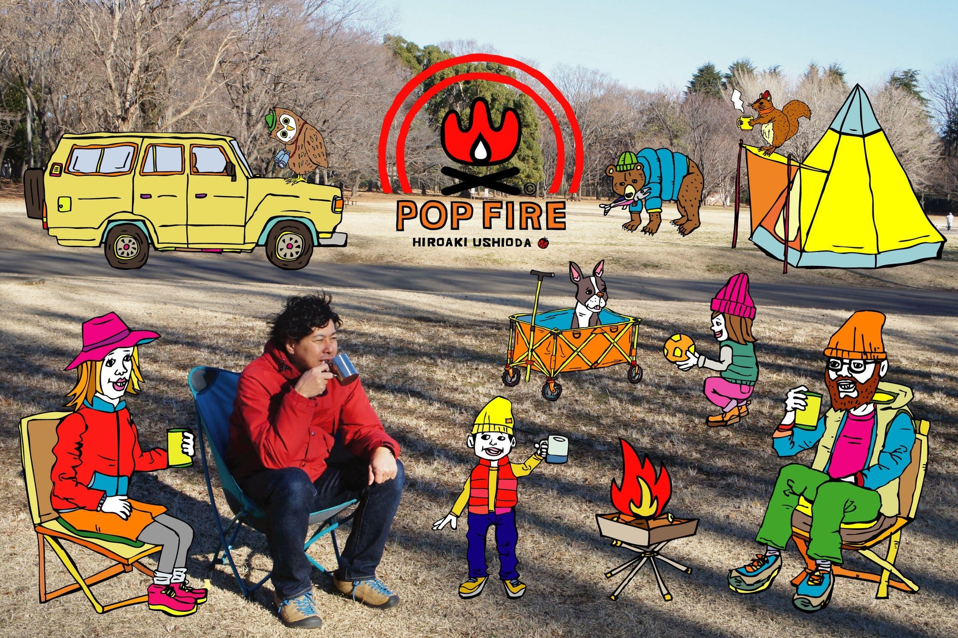 「POP FIRE」はアウトドアイラストレーター「ウシオダヒロアキ」が立ち上げたアウトドアグッズブランド。2020年に感染症の拡大で環境が大きく変化する中、彼自身が書き下ろしたPOPなイラスト使い、ステッカーやキーホルダーなど、身近なアウトドアグッズの提供を通して「アウトドアライフ」を楽しく演出したい、という思いからスタート。