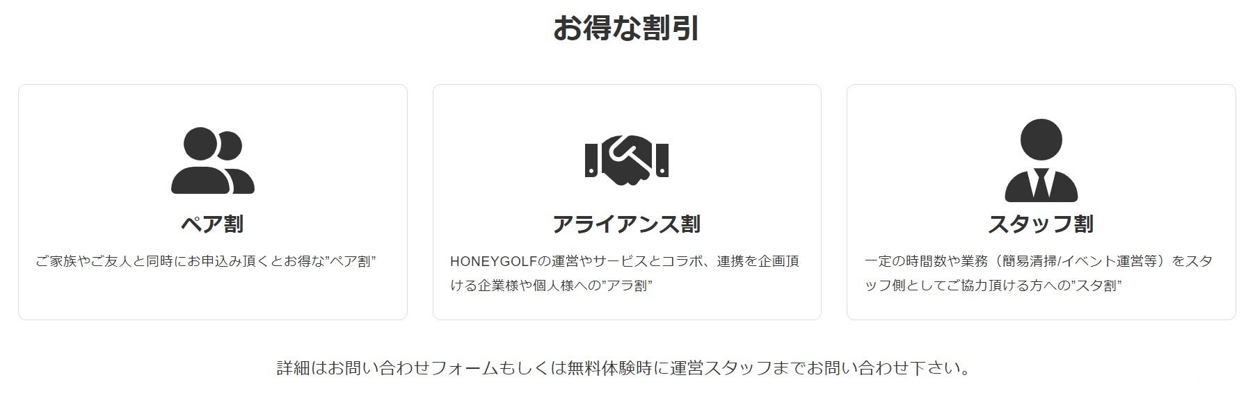 法人契約や非会員様向けの貸切プラン等、多様なご利用シーンにお応えできる環境をご用意しております。各種ユニークな割引制度をご用意しておりますのでお気軽にお問い合わせ下さいませ。