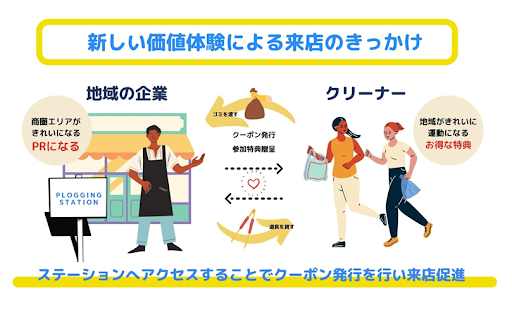 また、協力企業の来店促進や認知拡大など企業メリットを生み出すとともに、地域活性化を図ります。「プロギング」への興味関心を高め、楽しさを分かち合い、継続してもらえる環境づくりを地域企業、自治体など様々なステークホルダーと連携して推進します。