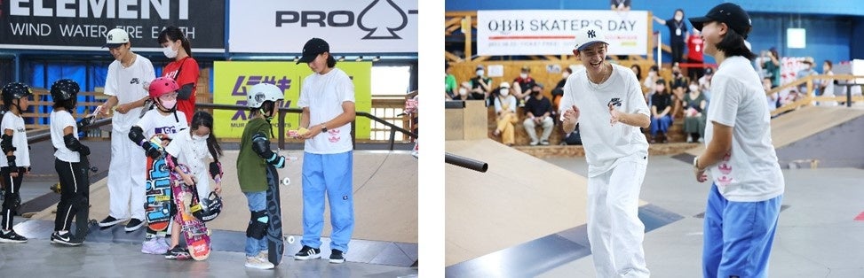 午後の部では、ムラサキパーク東京が無料一般開放され多くの方が来場しストリートスポーツに挑戦しました。またパークには再び白井選手・西矢選手が登場し来場者との交流イベントを開催。白井選手と西矢選手による華麗な演技が一般来場者の目の前で繰り広げられたほか、両選手は一般来場者と一緒に滑り、時にアドバイスを送るなど交流深めていきました。来場者の方々も普段なかなか見ることのできないプロの選手の技に圧倒されながらも、プロの選手と一緒に滑ることのできる貴重な機会を楽しんでいる様子でした。