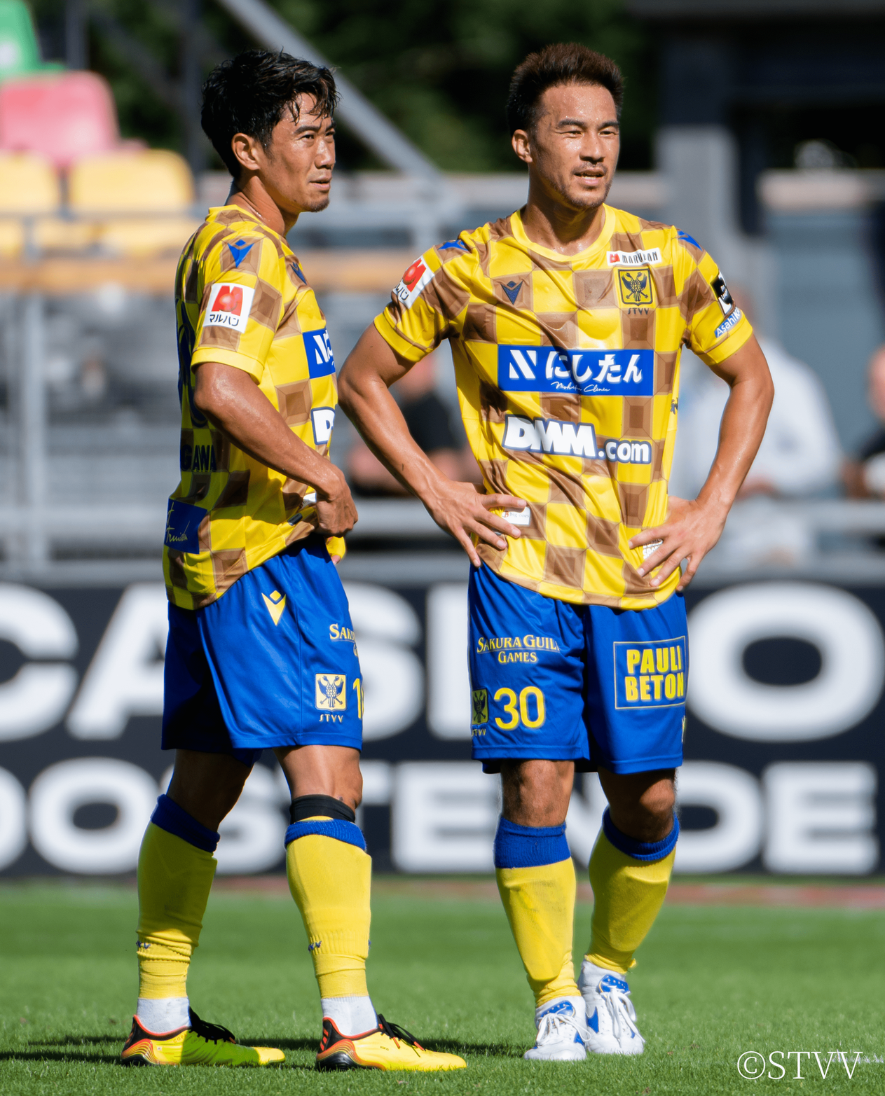 先日ゴールド・スポンサー契約締結の発表を行いましたシント=トロイデンVVの公式戦ユニフォームにおいても、パンツの右腿部分(番号の上あたり)に掲示頂いております。8月20日に開催されたサッカーベルギー1部リーグの公式戦より着用頂いております。