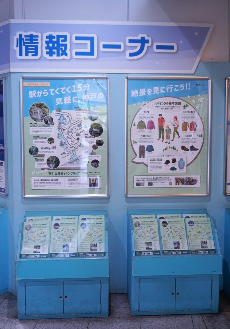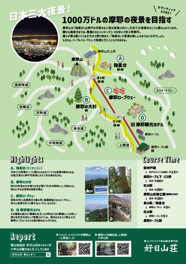 創業から98年目を迎える好日山荘の豊かな知見を活かした六甲山エリアの情報や実際のハイキング装備のディスプレイ、六甲山のヒストリーパネルなど、新神戸駅を利用する皆さまに分かりやすく、楽しみながら六甲山エリアを知っていただける内容となっております。無料配布のオリジナルマップは爽快な布引の滝巡り、1000万ドルの夜景を楽しめる摩耶山、神戸のランドマーク市章山&錨山の3種類をご用意し、皆さまのスケジュールや体力によって選べるコース提案を行っております。