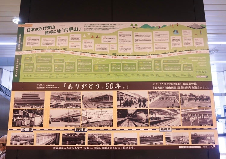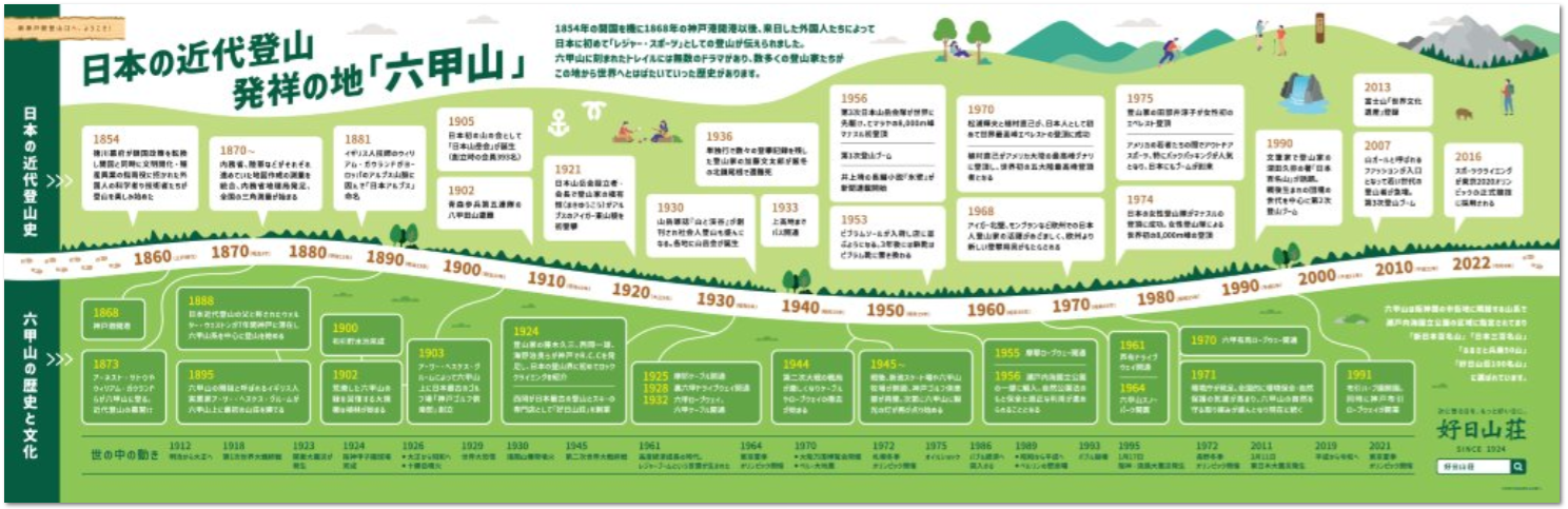 好日山荘はこのディスプレイを通じて、地元・神戸を盛り上げつつ、皆さまの登山・アウトドアライフを応援します。登山愛好家はもちろん、アウトドアの経験がない方でも気軽に街と山をつなぐ新神戸駅にお越しいただき、六甲山の魅力がギュっと詰まった本エリアでのハイキングをお楽しみ下さい。また、装備のご購入やハイキングでのご相談がございましたら、隣接するJR三ノ宮駅からすぐの「好日山荘 センタープラザ神戸本店」を是非ご利用下さい。
